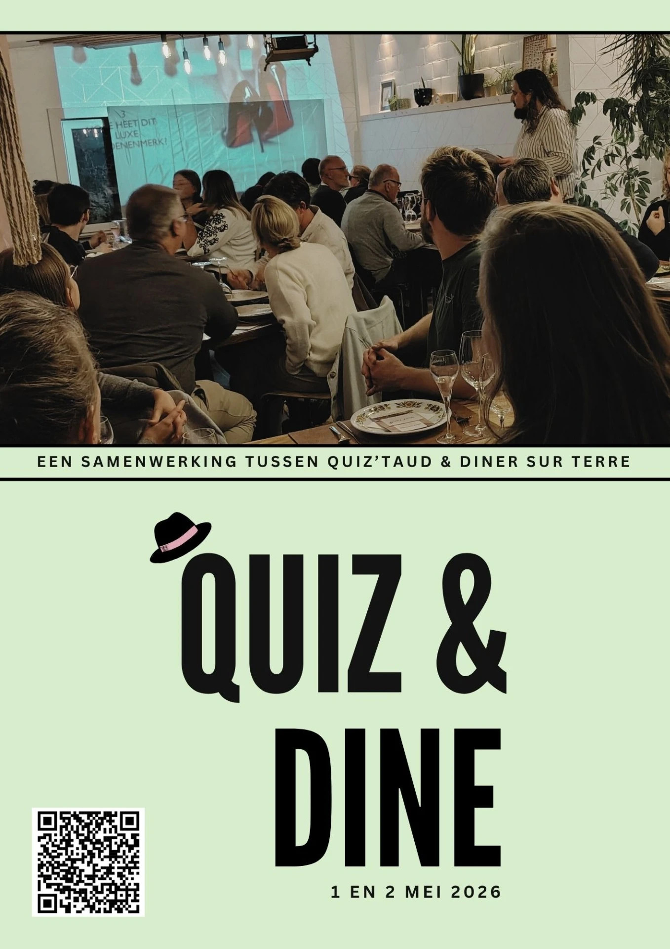 1 en 2 mei 2026 slaan Quiz'taud en Diner Sur Terre de handen in elkaar voor een uniek avondje uit. Je schuift aan voor een volledig verzorgd diner met verrassende smaken, terwijl een originele quiz je tussen de gangen door uitdaagt.
